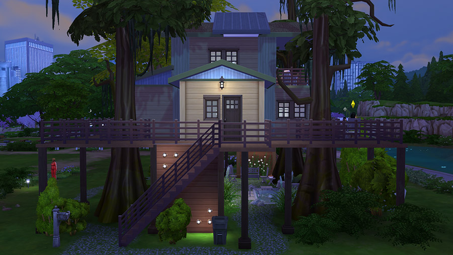 This treehouse is suitable for nature-lovers who want to live a more self-sufficient life. While the rooms are small in general, it offers a simple, yet comfortable lifestyle and it has all the basic necessities that your Sims need.
