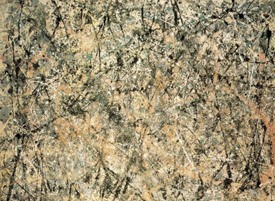 Pollock himself invented a new way of working, historically important in method and concept. He used the brush in a new way - dripping and pouring paint in swirls and drips around the canvas, which he placed on the floor. The resultant space of this multi-layered imaging was unlike any space seen so far; it reminds me of outer space - infinite space, which we see as a limitless but flat surface. This type of composition came to be called "all-over" - which means that every part of the canvas is equal to every other, and all are on the same plane in space. This is in contrast to traditional composition, which dictated that there be a focal point in the painting, one area that was the more important.